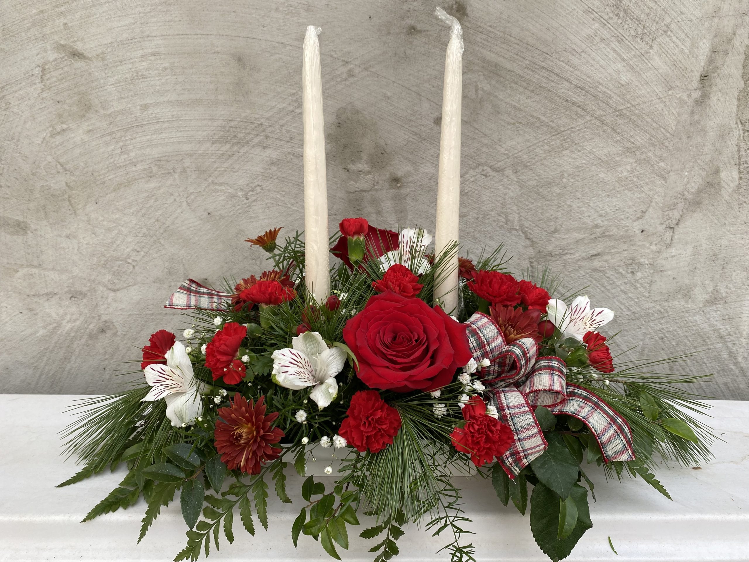 A long and low centerpiece with candles to dress up your table!  Arranged with roses, asltro, mini carns and mums.
