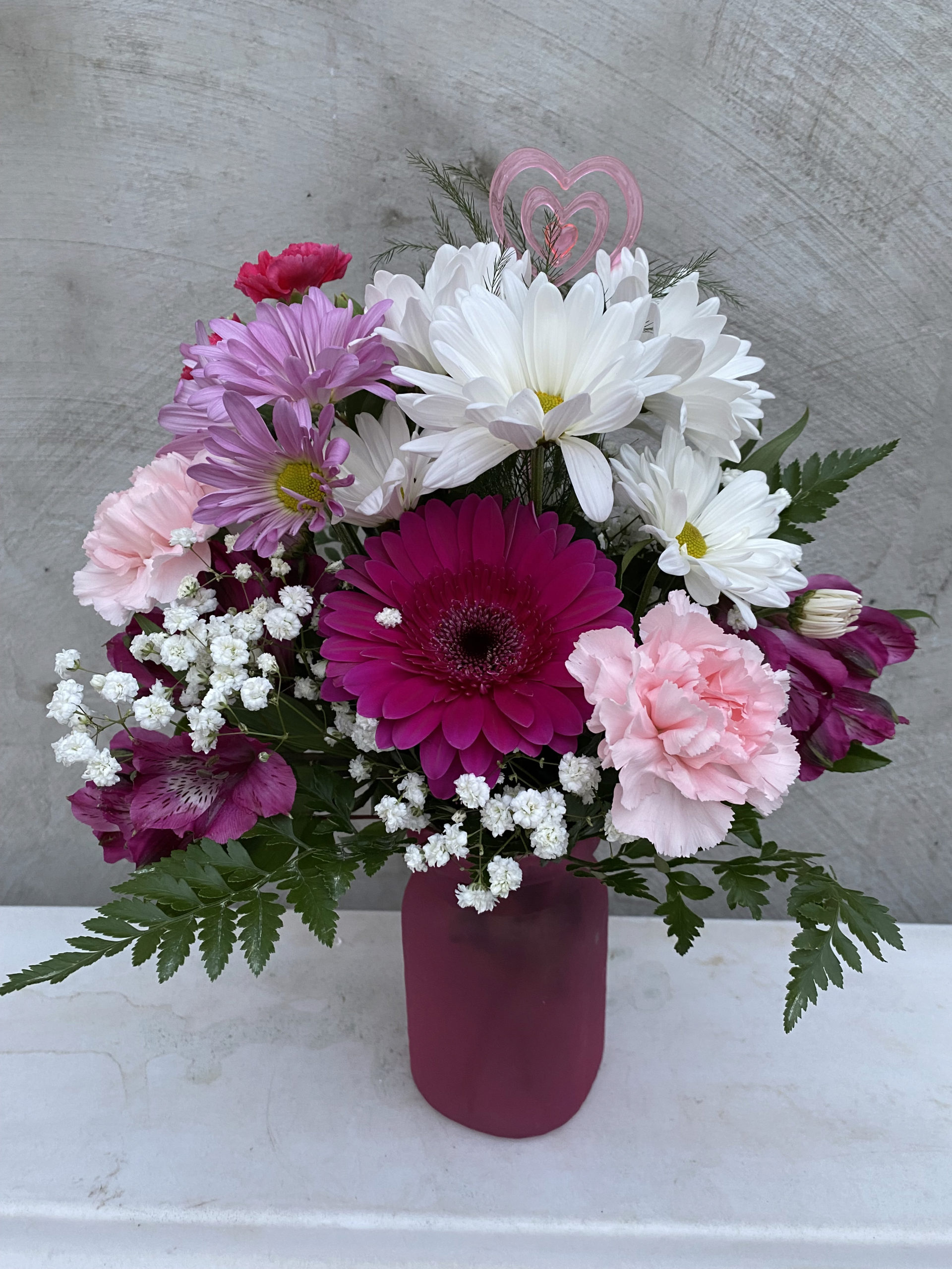 An arrangement of alstro, carnations and daisies in valentine colors arranged in a colored vase with a swirl heart pick.